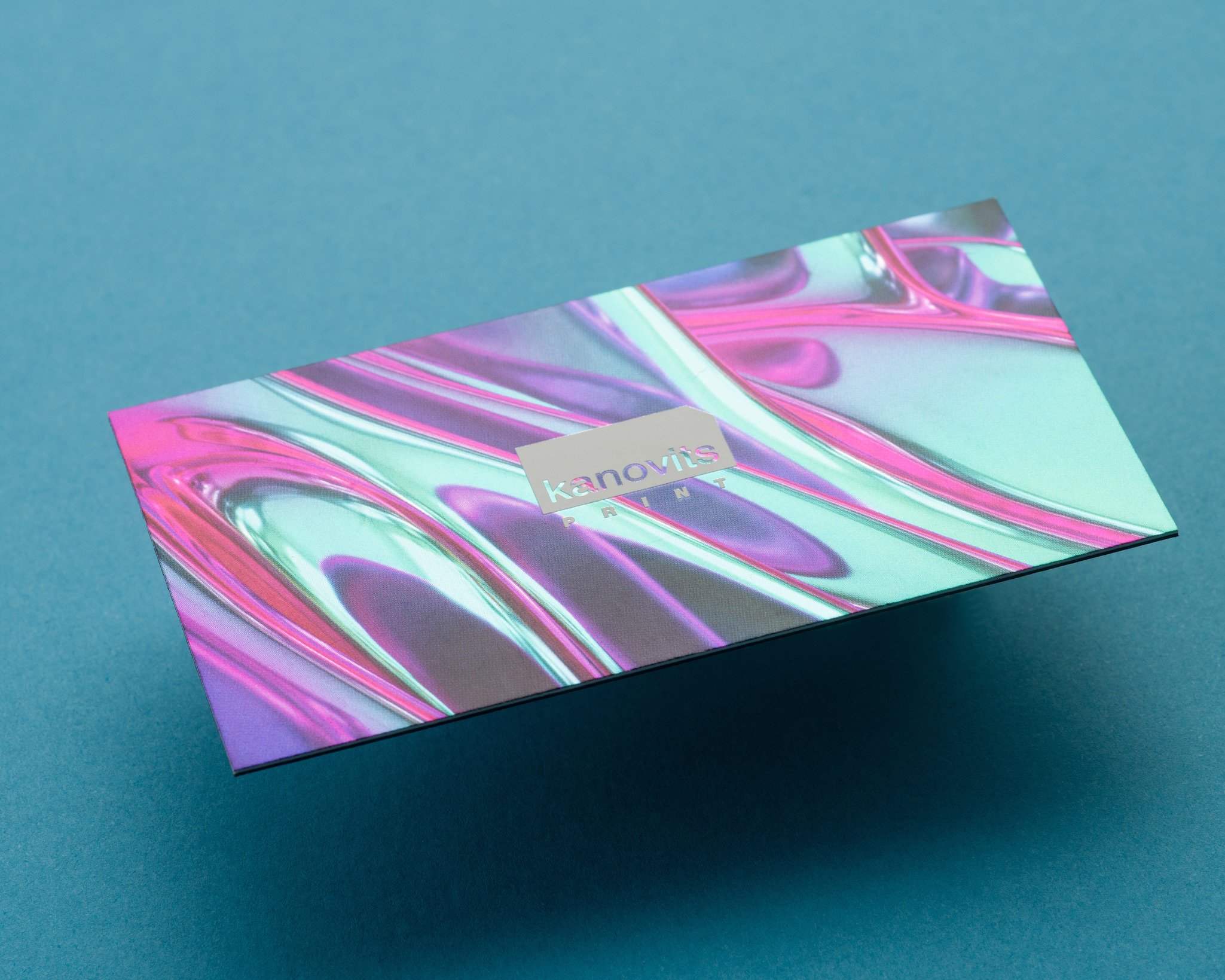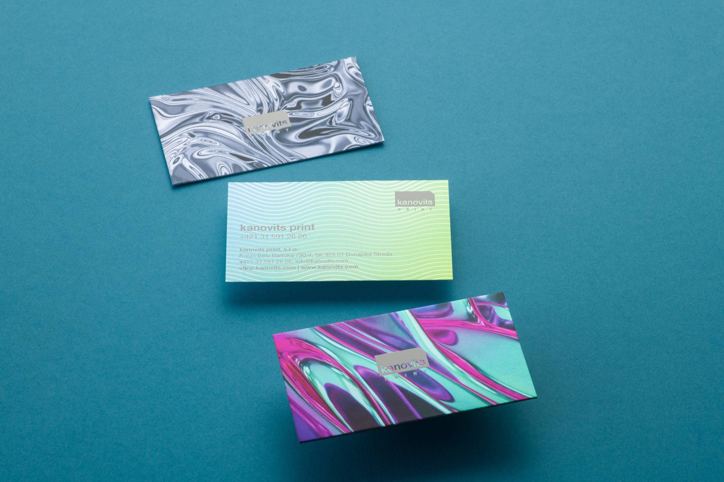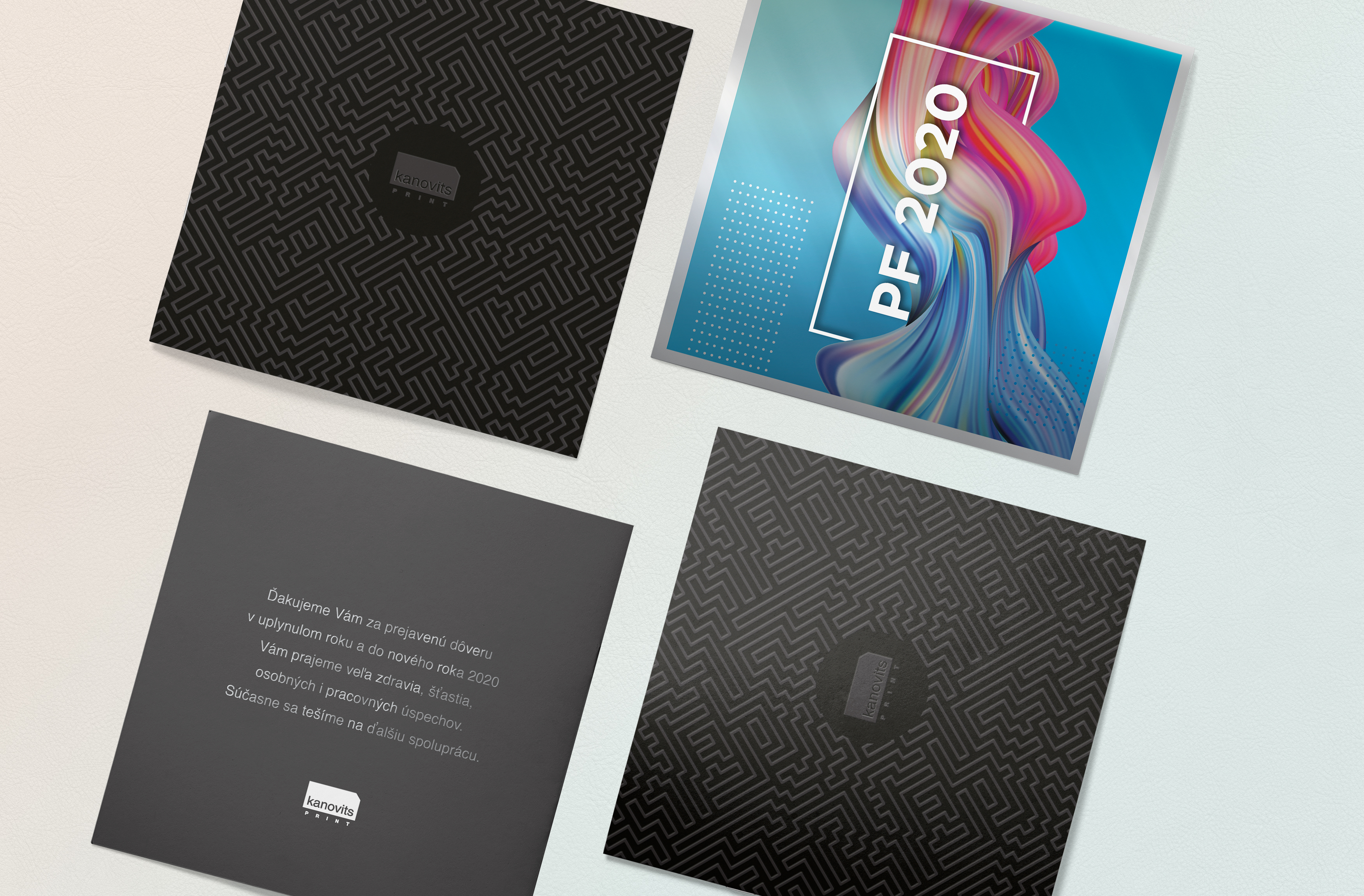 I designed a box with a sleeve, with several geometric and organic patterns. I also used 3 – later modified – Shutterstock images for the business cards to experiment with white and CMYK printing on Mirror papers. For the holiday cards, I used the rainbow colour theme from our previous campaign and combined it with the same technology (white and CMYK printing on Mirror papers, silver ink and clear varnish on black Plike papers).